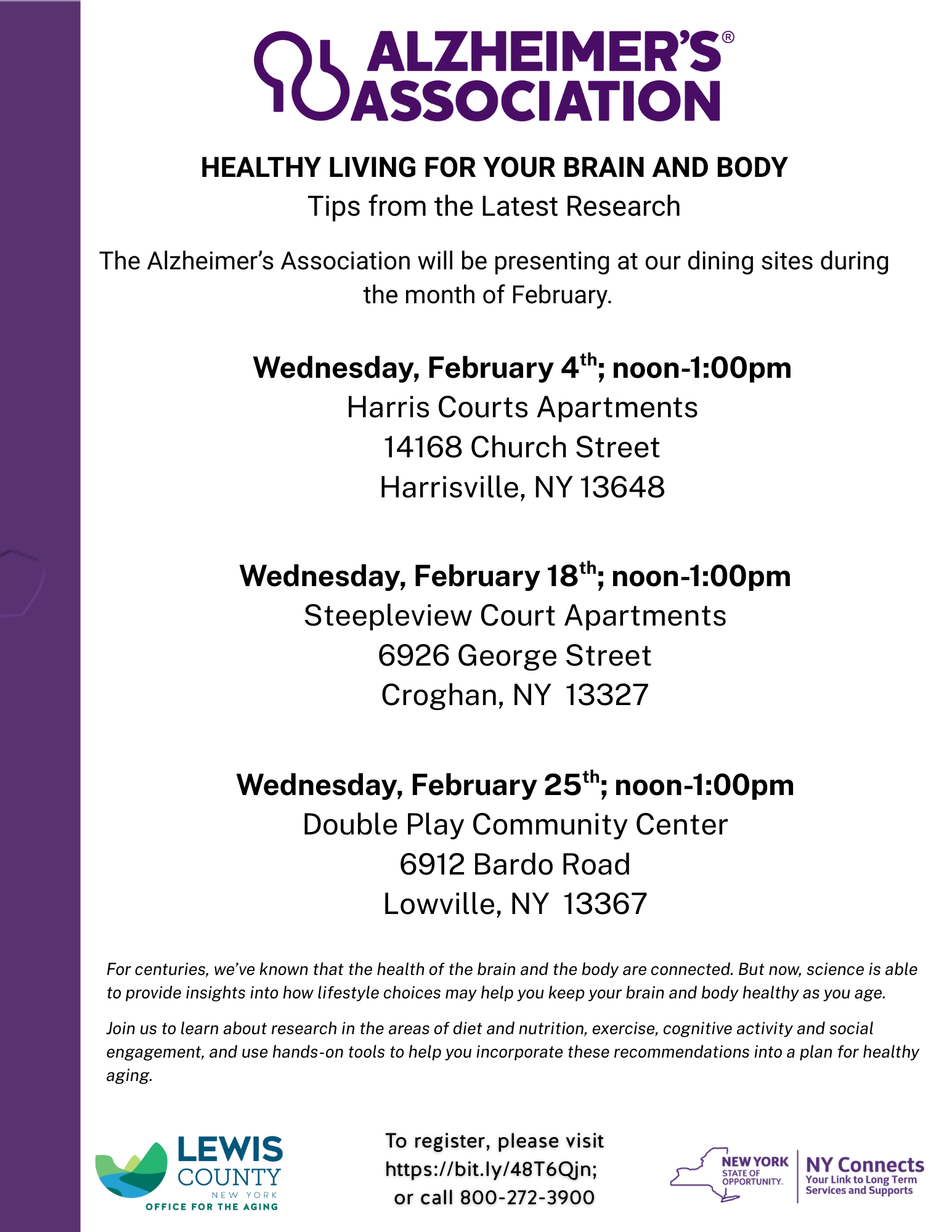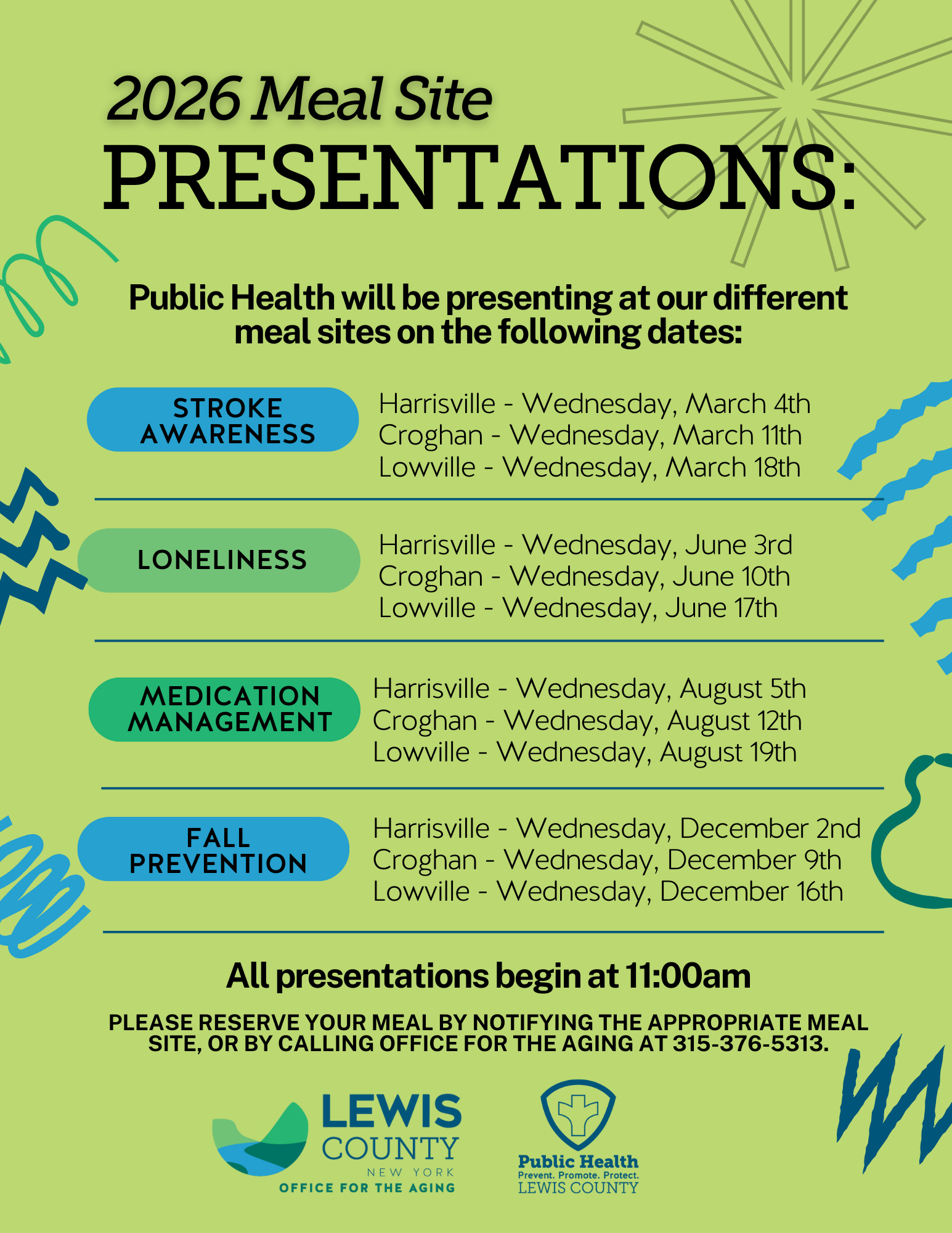 Our community dining sites are located throughout Lewis County, which includes Copenhagen, Croghan, Harrisville, Lowville & Lyons Falls (scroll down further for exact locations).