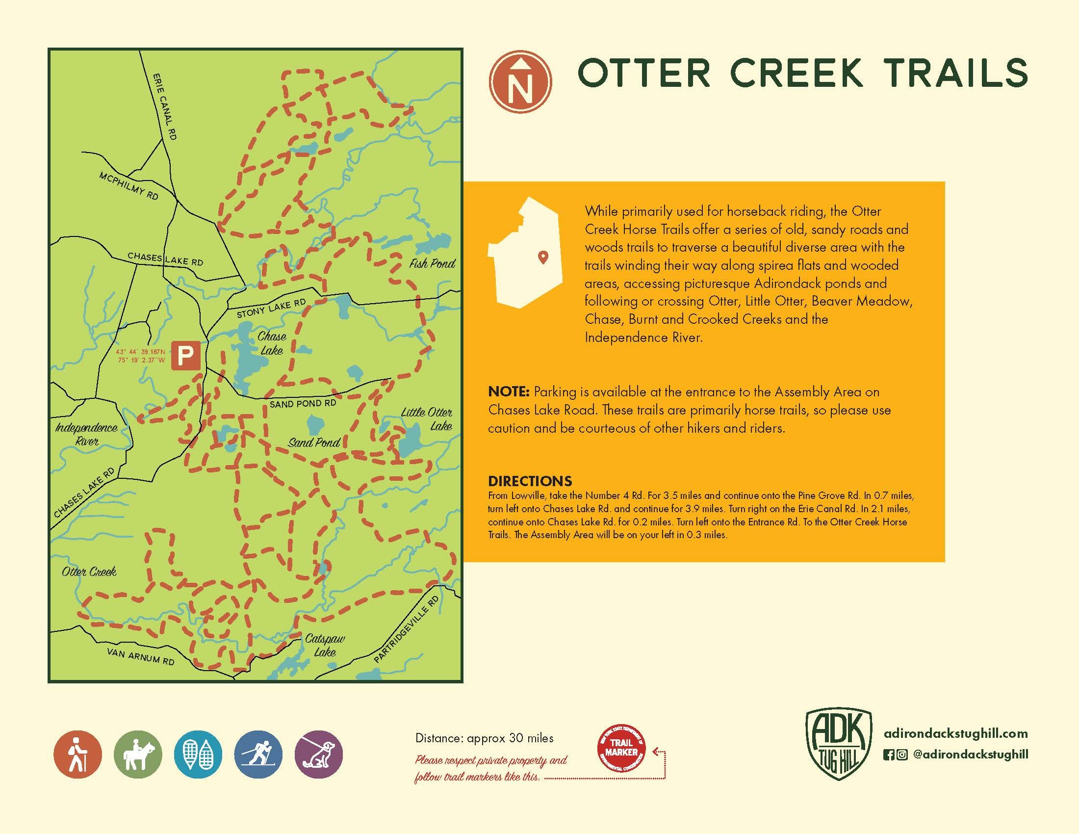 Primarily used for horseback riding, the Otter Creek Horse Trails offer a series of old, sandy roads and wooded trails to traverse a beautiful, diverse area with the trails winding their way along spirea flats and wooded areas. You can access picturesque Adirondack ponds and following or crossing Otter, Little Otter, Beaver Meadow, Chase, Burnt and Crooked Creeks, and the Independence River.