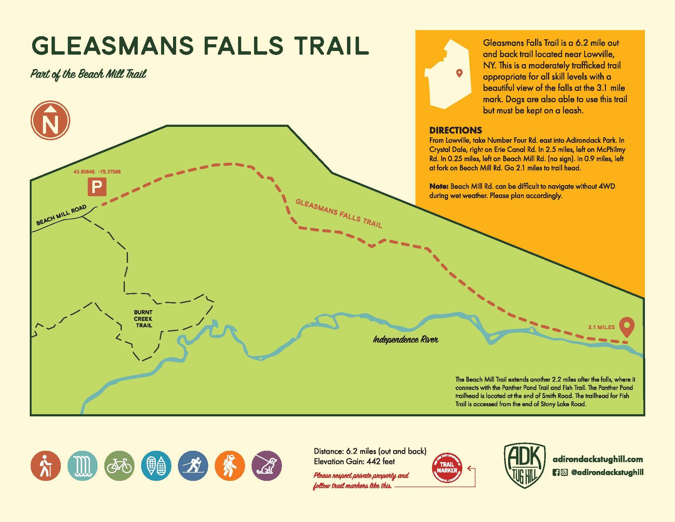 Gleasmans Falls Trail is a 6.2 mile out and back trail located near Lowville, NY. This is a moderately trafficked trail appropriate for all skill levels with a beautiful view of the falls at the 3.1 mile mark. Dogs are also able to use this trail but must be kept on a leash.