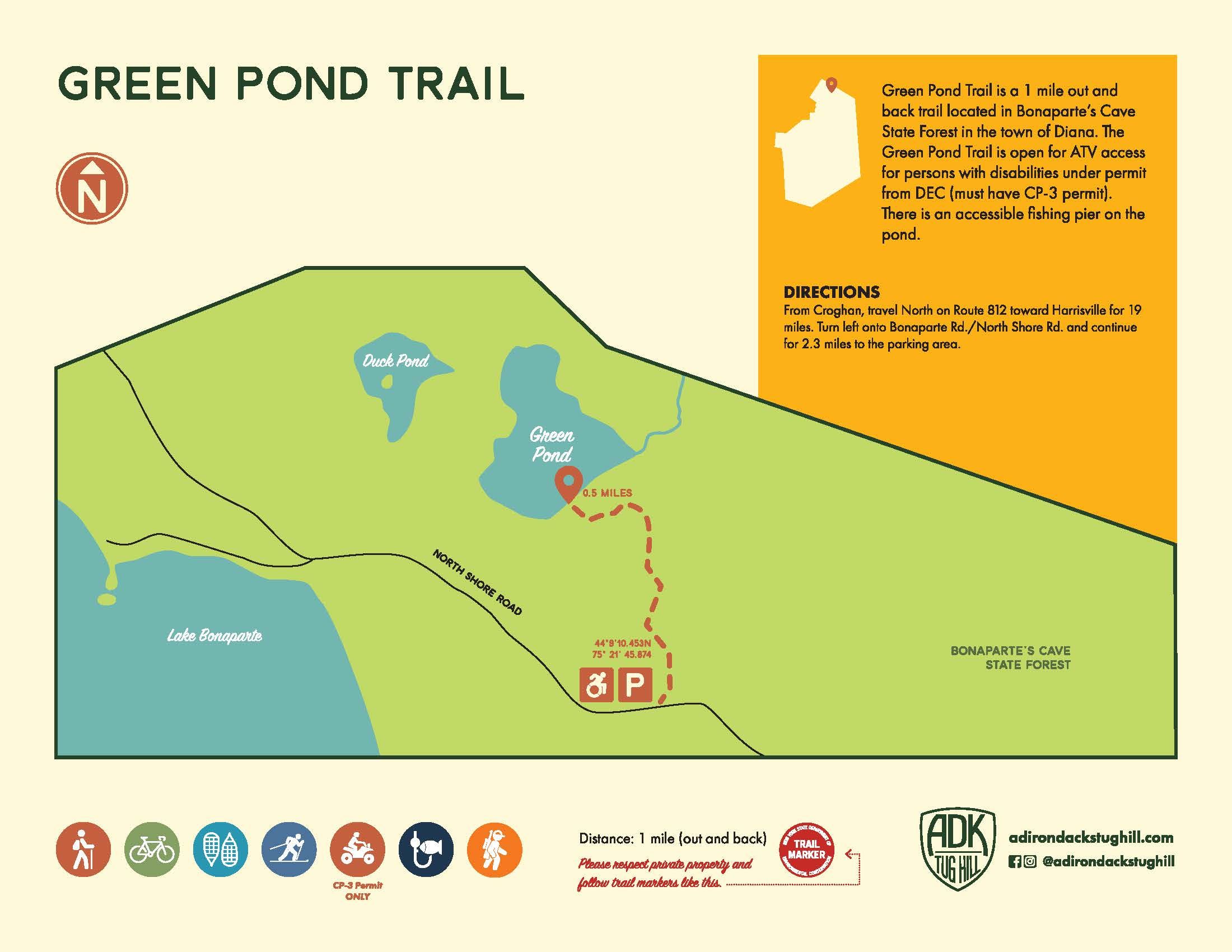 Green Pond Trail is a 1 mile out and back trail located in Bonaparte’s Cave State Forest in the town of Diana. The Green Pond Trail is open for ATV access for people with disabilities under permit from DEC (must have CP-3 permit). There is an accessible fishing pier on the pond.
