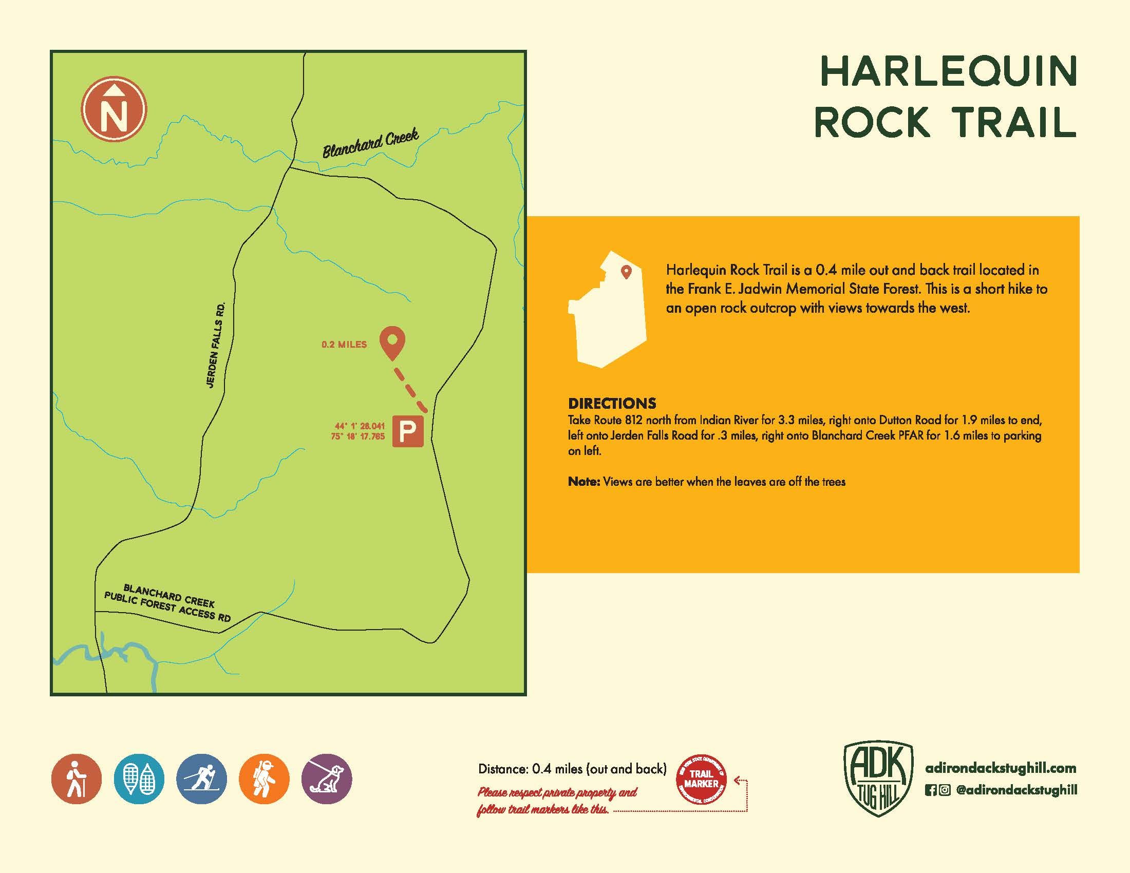 Harlequin Rock Trail is a 0.4 mile out and back trail located in the Frank E. Jadwin Memorial State Forest. This is a short hike to an open rock outcrop with views toward the west.