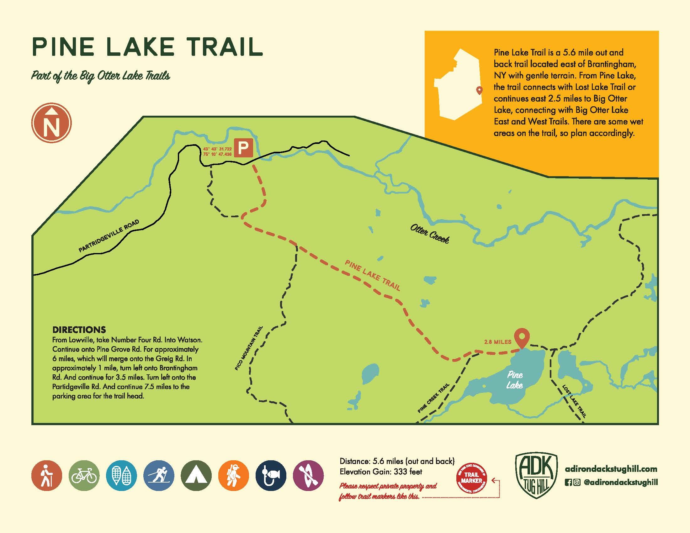 The Pine Lake Trail is a 5.6 mile out and back trail located east of Brantingham, NY with gentle terrain. From Pine Lake, the trail connects with Lost Lake Trail or continues east 2.5 to Big Otter Lake, connecting with Big Otter Lake East and West Trails. There are some wet areas on the trail, so plan accordingly.
