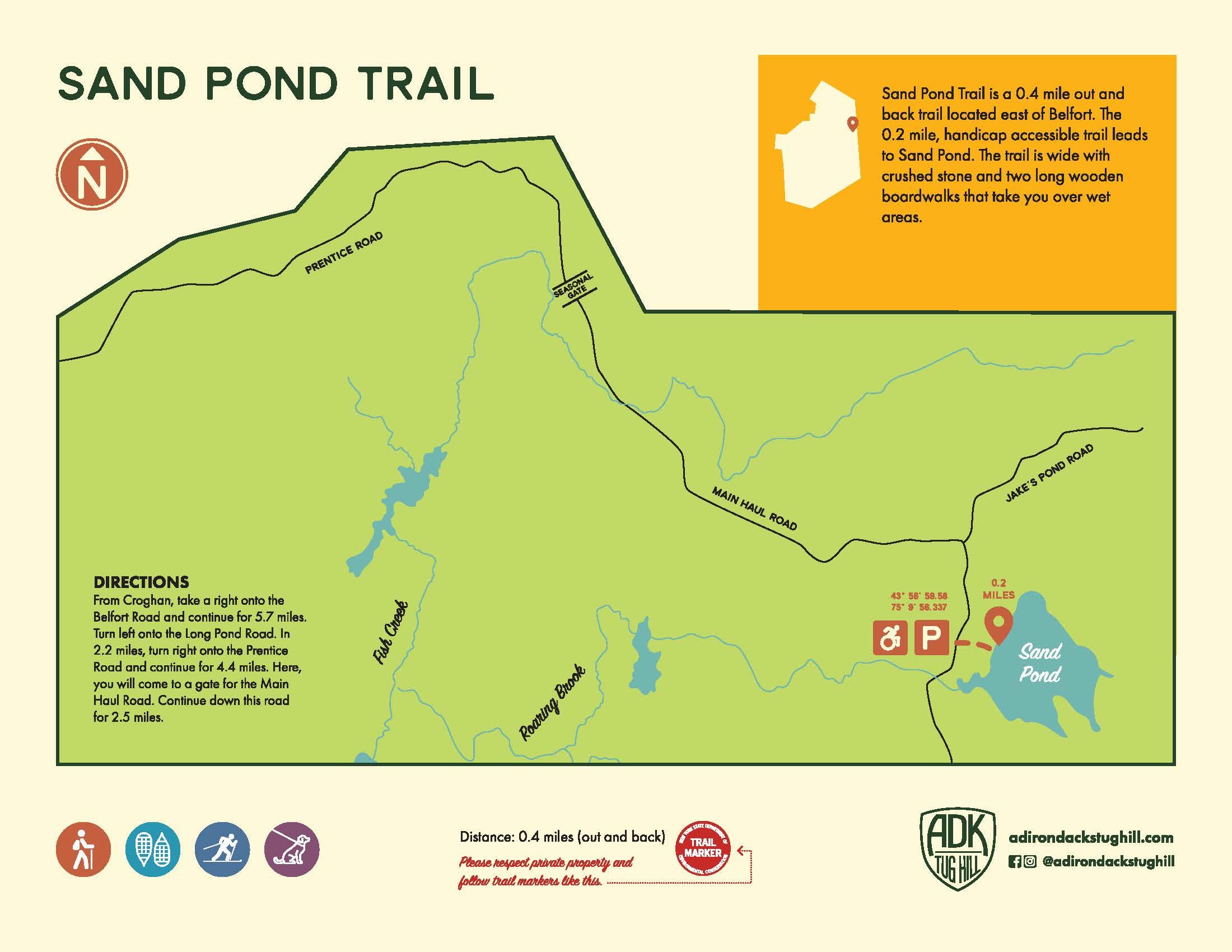 Sand Pond Trail is a 0.4 mile out and back trail that is located east of Belfort. The 0.2 mile, handicap accessible trail leads to Sand Pond. The trail is wide with crushed stone and two long wooden boardwalks that take you over wet areas.