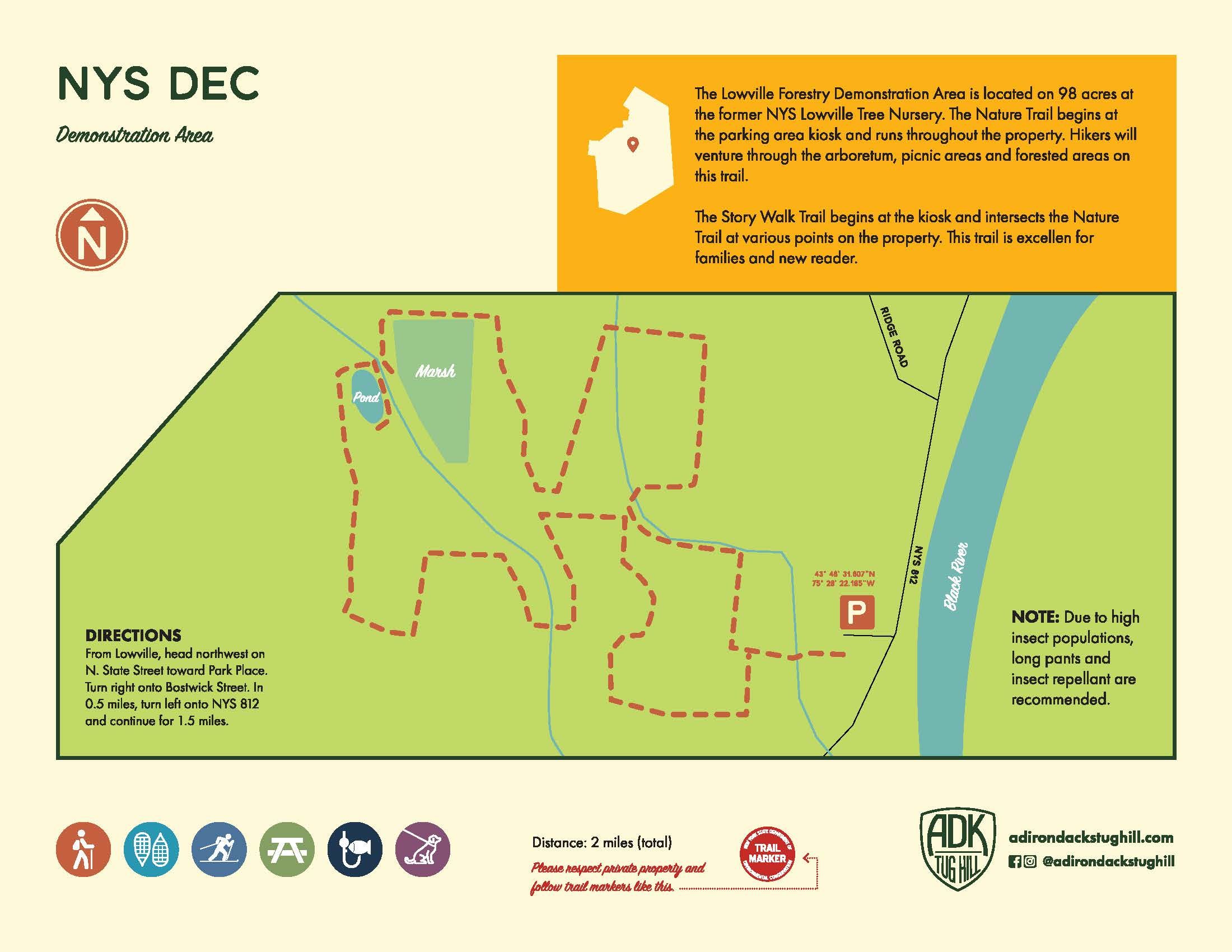 The Lowville Forestry Demonstration Area is located on 98 acres at the former NYS Lowville Tree Nursery. The Nature Trail begins at the parking area kiosk and runs throughout the property. Hikers will venture through the arboretum, picnic areas and forested areas on this trail.