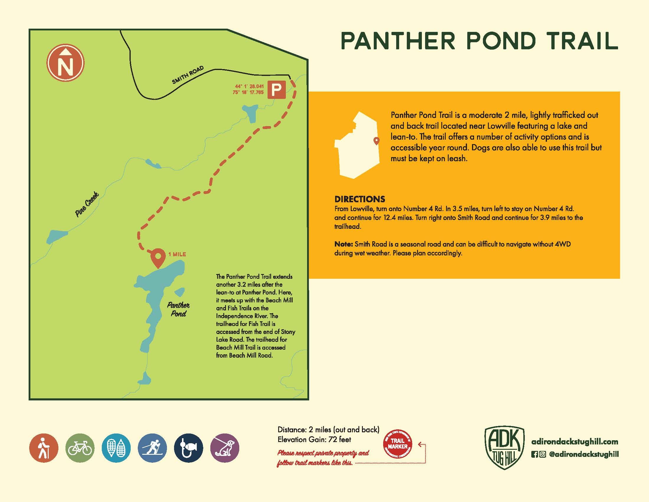 The Panther Pond Trail is a moderate 2 mile, lightly trafficked out and back trail located near Lowville featuring a lake and lean-to. The trail offers a number of activity options and is accessible year round. Dogs are also able to use this trail but must be kept on a leash.
