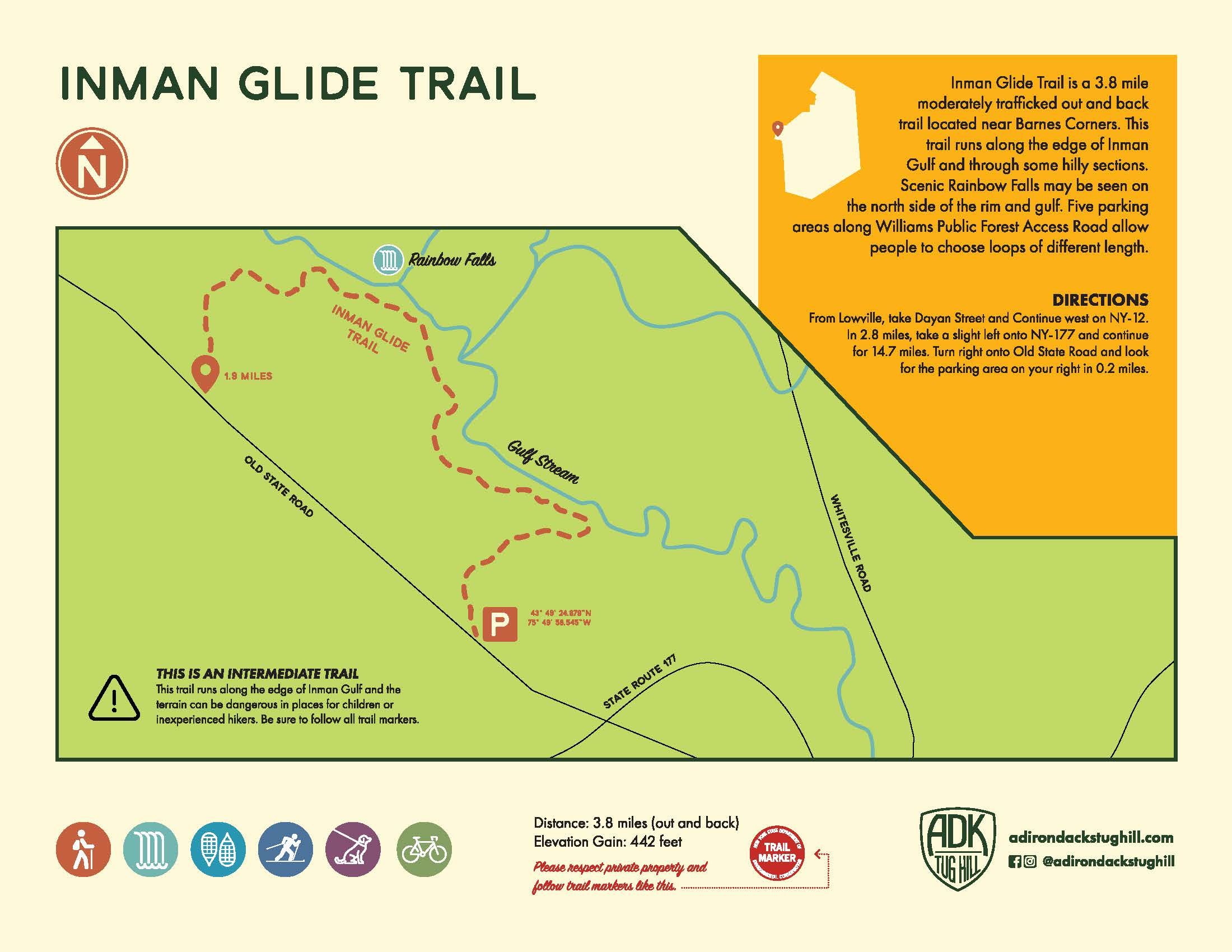 Inman Glide Trail is a 3.8 mile moderately trafficked out and back trail located near Barnes Corners. This trail runs along the edge of Inman Gulf and through some hilly sections. Scenic Rainbow Falls may be seen on the north side of the rim and gulf. Five parking areas along Williams Public Forest Access Road allow people to choose loops of different length.