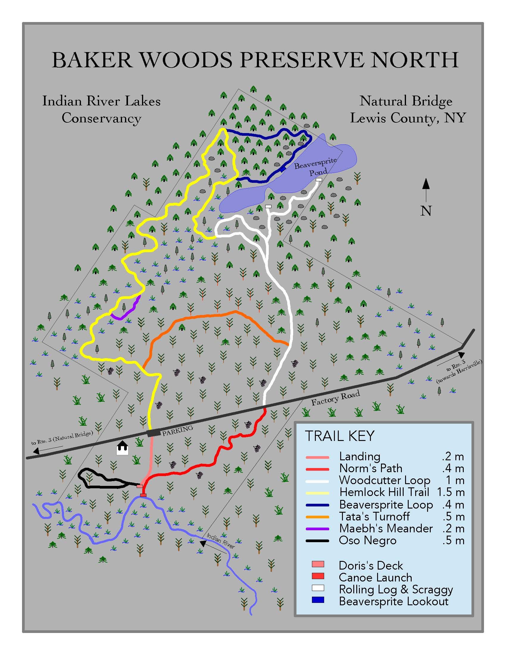 Directions: From Lowville, take Number Four Rd. east into the Adirondack Park. In Crystal Dale, right on Erie Canal Rd. In 2.5 miles, left on McPhilmy Rd. In 0.25 miles, left on Beach Mill Rd. (no sign). In 0.9 miles, left at fork on Beach Mill Rd. Go 2.1 miles to trail head.