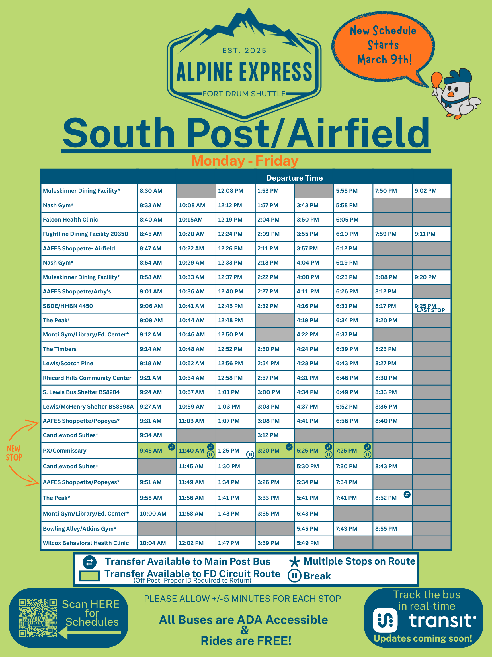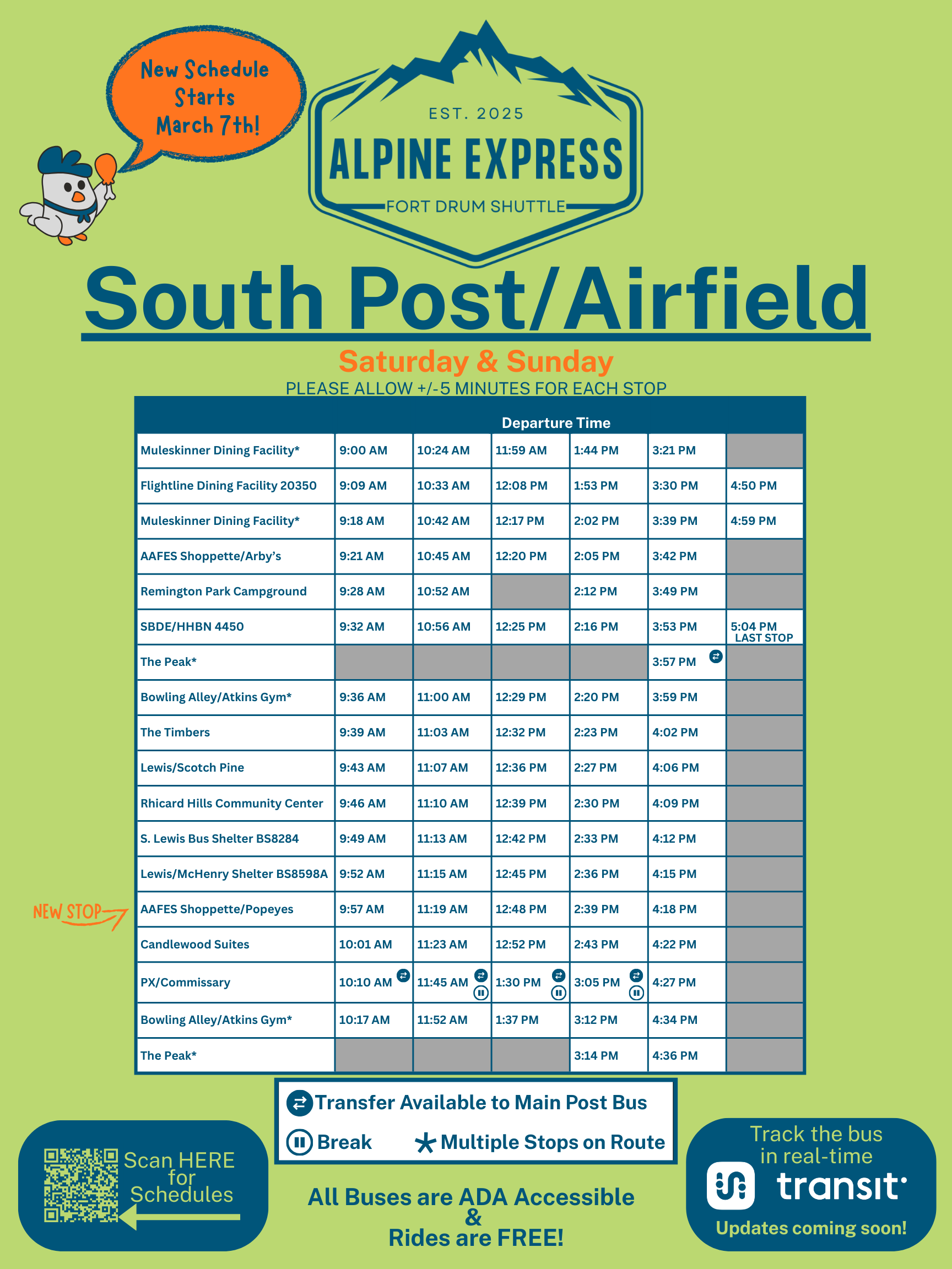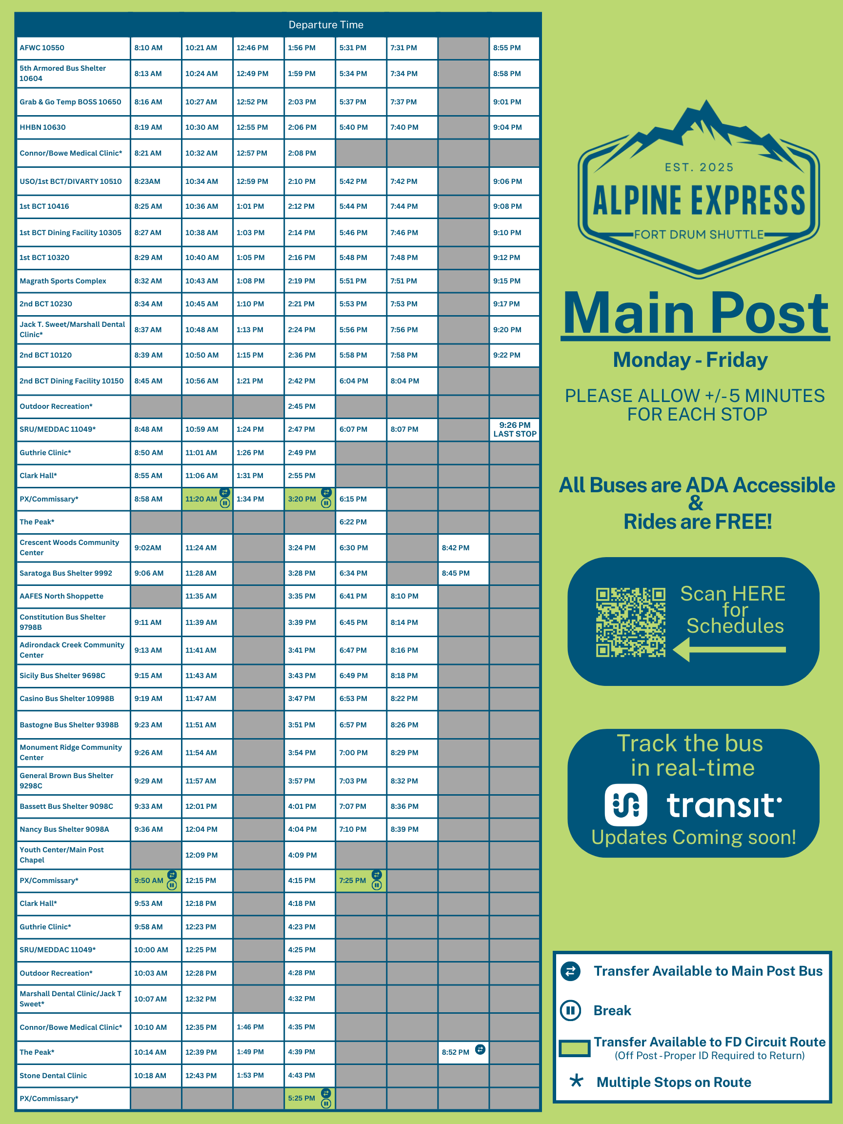 The Alpine Express was established in 2025, in partnership with Fort Drum, to provide reliable transit service around the base. The route is designed to support access for service members, employees, and visitors traveling on base.
