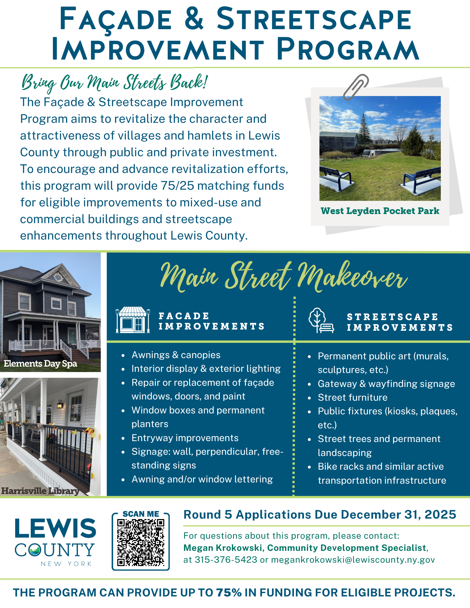 Lewis County’s downtown districts and public spaces hold central importance for community gatherings, special events, and the success of small businesses. The Façade & Streetscape Improvement Program aims to revitalize the character and attractiveness of villages and hamlets in Lewis County through public and private investment. To encourage and advance revitalization efforts, this program will provide 75/25 matching funds for eligible improvements to mixed-use and commercial buildings and streetscape enhancements in Lewis County’s villages and hamlets. Together, these improvements will help business growth and retention, enhance tourism, increase spending in the local economy, and reduce the number of blighted and vacant properties.
